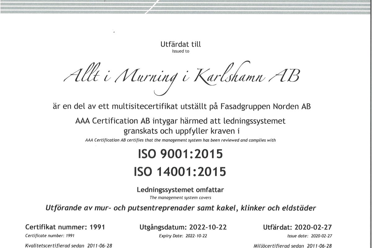 Allt i murning erhöll under våren 2020 certifikat för ISO 9001 och 14001.